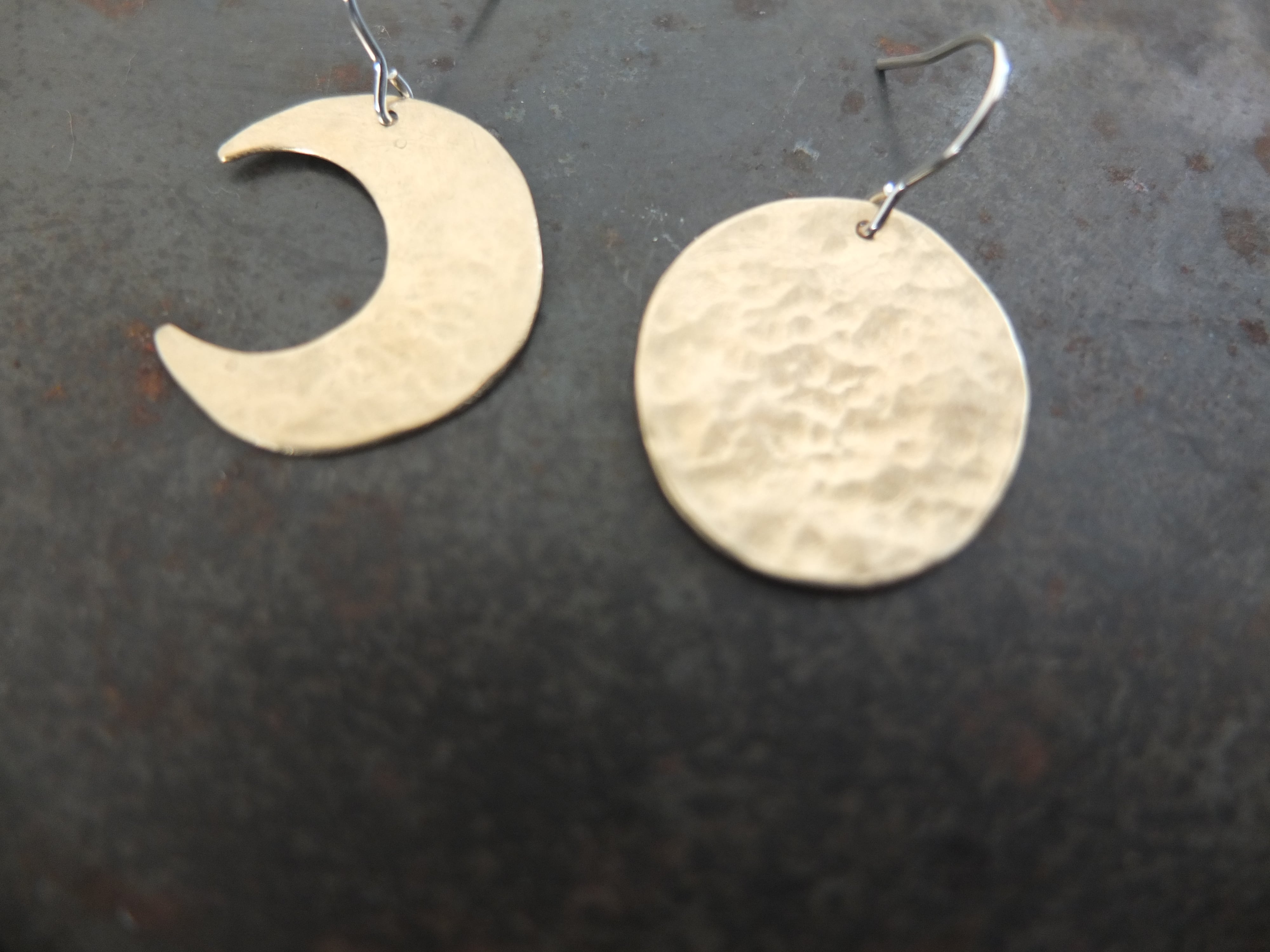 真鍮板を切り出して、金槌で槌目模様をつけて、ピアス金具をロー付けして、磨き上げて制作しています。